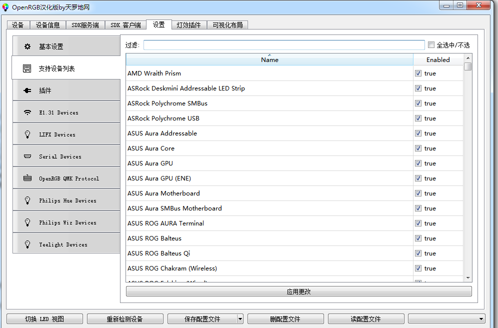 OpenRGB(開源RGB燈光控制軟件) 是國產軟件英文界面,OpenRGB是免費開源的RGB設備燈光控制軟件,支持控制鼠標、鍵盤、音箱等設備的燈光,各種顏色、光效自由選擇搭配,支持多種設備,還能查看設備信息,自定義保存配置文件,軟件十分小巧,操作簡單,有需要的朋友不要錯過。 這款開源RGB燈光控制軟件對于從事燈光效果研發的工程師朋友也還是很好的工具。 開源RGB天成工程師也有涉及過,燈光控制效果均可咨詢定制。 開源rgb控制軟件怎么用 這款軟件主要是英文看下圖,我這里演示的是漢化版,界面。
