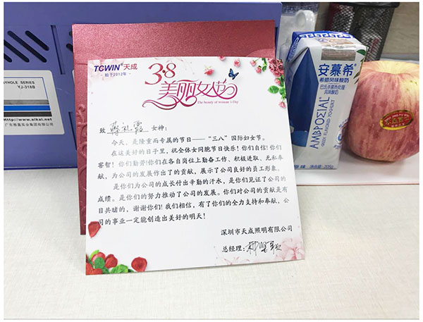 不僅有鮮花的溫情,天成照明還延續了一貫的溫暖, 為女神們準備了精致的卡片祝福和進口面膜禮品
