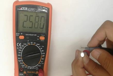 對于LED燈來說,發出不同顏色的光,壓降也有所不同,也就是正常工作電壓范圍會有所差別,如果自己要做的指示燈用到的LED燈,額定電壓是知道的那最好了,不知道也沒關系,用萬用表上的二極管檔可以把這個參數測量出來,例如下圖這個發白光的LED燈,顯示的壓降為2.58 V,這里我們就取LED燈的正常工作電壓(記為U)為2.5 V LED燈的正常工作電流用萬用表不能直接測量出來,一般像這種LED燈的正常工作電流在17 m A(一般情況下購買LED燈的時候會給出LED燈的額定功率和額定電壓,用功率去除上電壓就是LED燈的額定電流)左右,這里我們認為電流在15-20 m A(記為I 1-I 2)之間, LED燈都能正常工作。